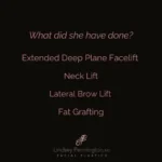 This patient in her 60s underwent an extended deep plane facelift, neck lift, lateral brow lift, and fat grafting to restore youthful contours and reduce signs of facial and neck aging.
