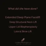 This patient underwent a lateral brow lift, upper and lower blepharoplasty, deep plane facelift, structural neck lift, lip lift, fat grafting, and laser resurfacing to lift and restore facial structure, brighten the eyes, and smooth skin for a natural, refreshed result.