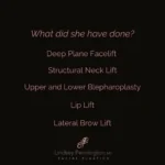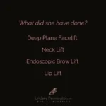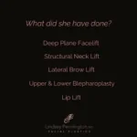This patient in her 70s achieved a beautifully defined and rejuvenated look through a deep plane facelift, structural neck lift, lateral brow lift, lip lift, and a small chin implant.