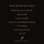 This beautiful patient in her 70’s previously underwent two facelift procedures with another surgeon and was frustrated by the continued redundancy of excess skin around her neck. Despite two previous surgeries, she still felt she looked “grumpy” and “tired”.